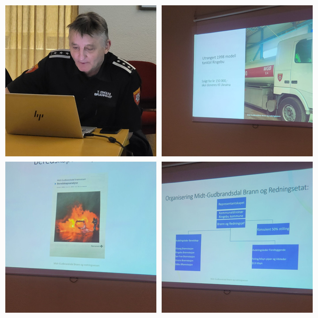 Tor Engum holdt en interessant orientering om dagens brann- og redningstjeneste i regionen. Han understreket at tjenesten i økende grad er første enhet på stedet ved ulykker og hendelser, og at oppgavespekteret har blitt bredere de siste årene.