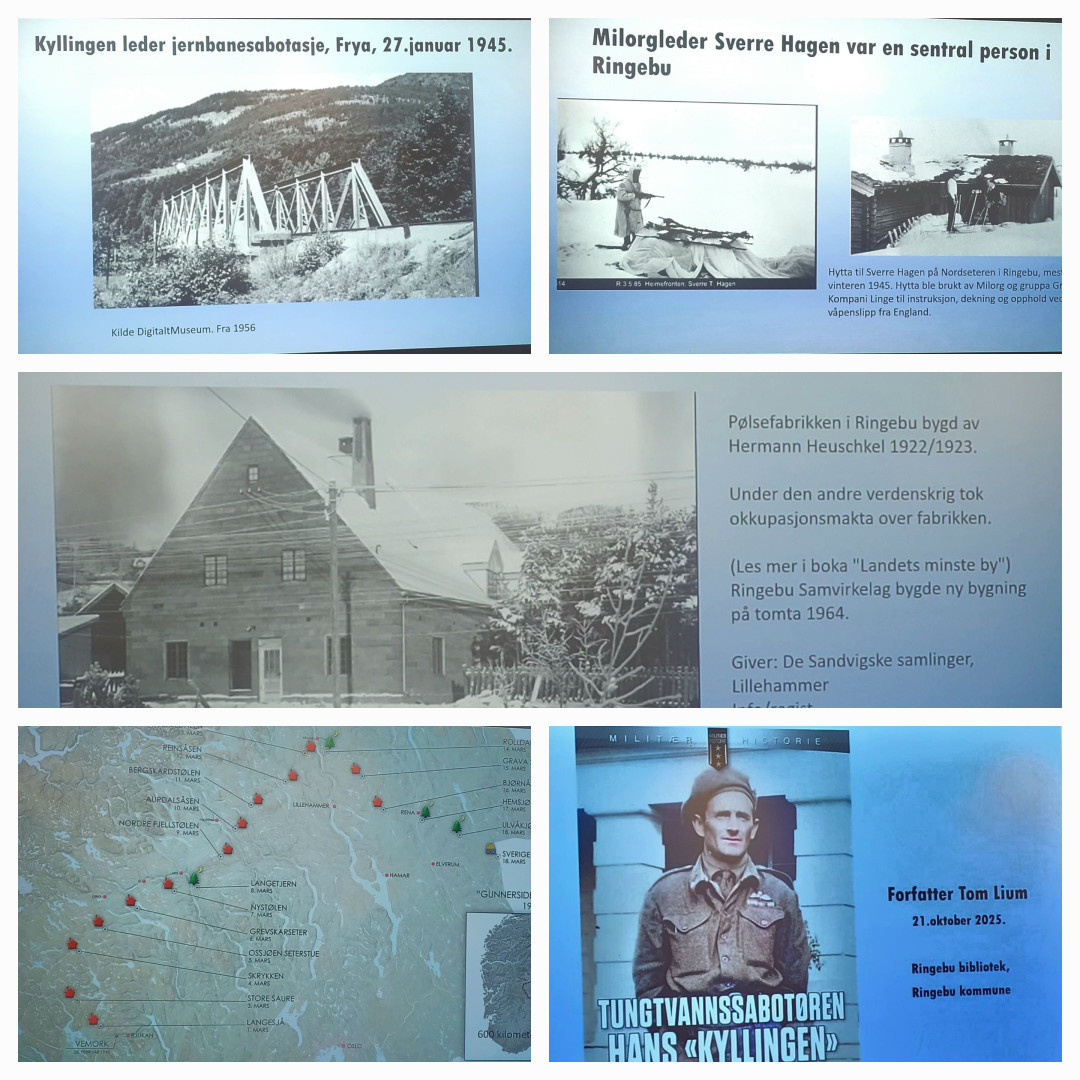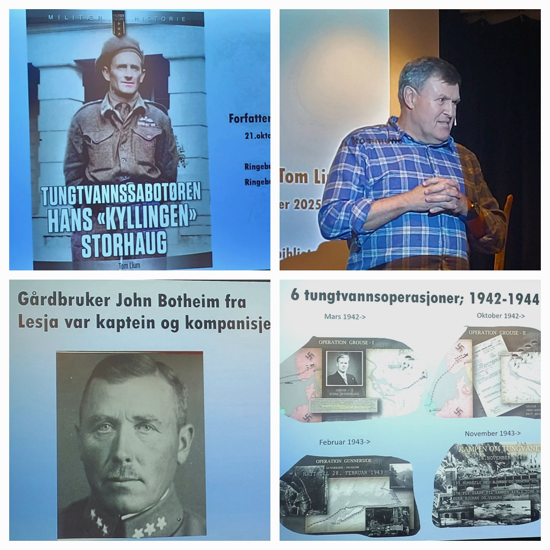 Tom Lium besøkte Ringebu bibliotek 21.10.2025 og presenterte boka Tungtvannssabotøren, Hans Storhaug. Han viste hvordan Storhaugs innsats i tungtvannsaksjonene var del av et større nettverk med streng planlegging, lokal forankring og høy risiko. Lium la vekt på mennesket bak heltebildet: beskjedenhet, pliktfølelse og etterkrigstidens stillferdige liv. En egen del handlet om Gudbrandsdalen – kart, foto og kilder dokumenterte forflytninger, støtteapparat og terrengbruk som muliggjorde skjuling og trygg ferdsel. Kvelden avsluttet med spørsmål, signering og oppfordring om å dele lokale minner og materiale.